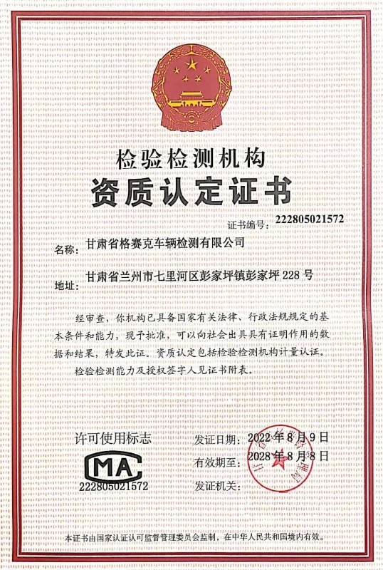 近日,装备公司子公司甘肃省格赛克车辆检测有限公司顺利取得甘肃省市场监督管理局颁发的检验检测机构资质认定(CMA)换证复核资质证书,确保了各项车检业务的顺利开展。