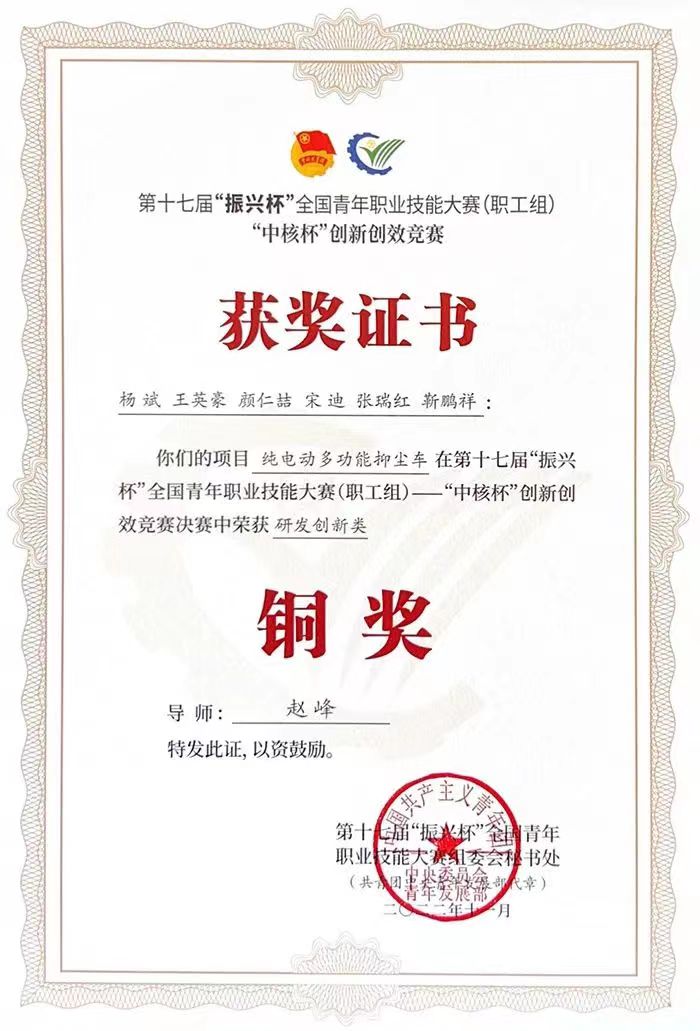 第十七届“振兴杯”全国青年职业技能大赛(职工组)——“中核杯”创新创效竞赛全国决赛圆满落幕。“振兴杯”全国青年职业技能大赛是由共青团中央和人力资源和社会保障部主办的国家一类大赛,本次“振兴杯”首次面向青年职工增设了“中核杯”创新创效专项竞赛,设置研发创新类、技术革新类、管理创新类三个竞赛方向。经过层层选拔和严格评审,装备公司团委所属重工科技公司青年集体选送的创新类项目成果《纯电动多功能抑尘车》获得了研发创新类全国铜奖的好成绩。