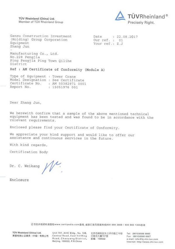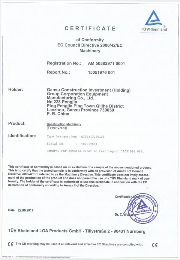 星空网页版生产的高漠牌塔式起重机QTZ63(TC5013)于2017年8月22日通过了欧盟关于产品样机和资料的审核,取得了由德国莱茵TüV集团(Notified Body number:0035)颁发的CE证书,证书编号为:AM 50382971 0001。