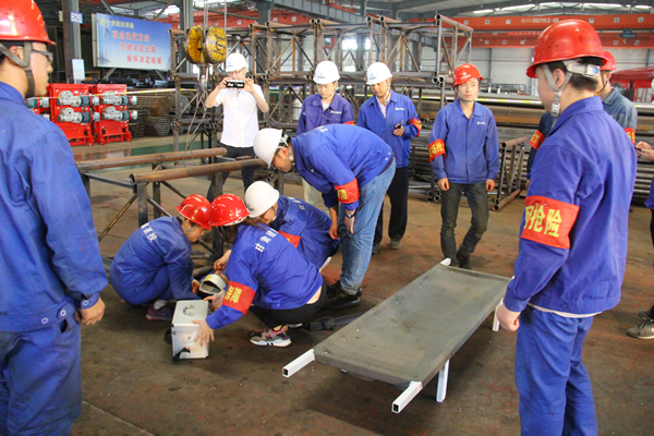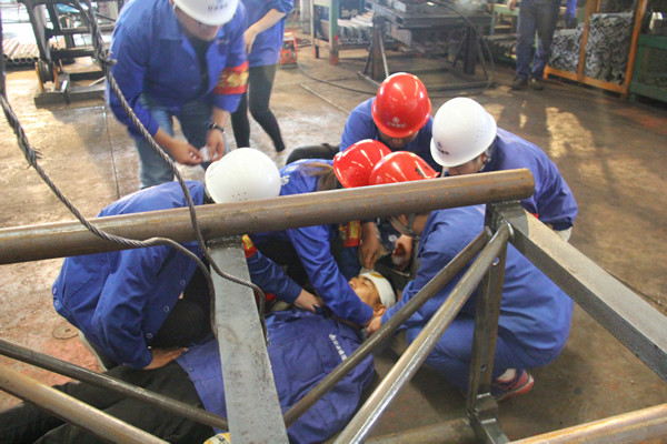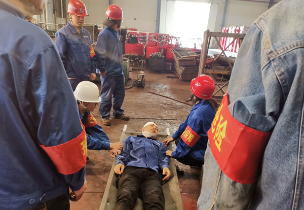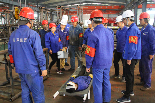 上午9点40分演练开始,事故模拟发生在一车间生产线上,有1名作业人员被厂房掉落的隅撑砸中头部昏迷。车间主任迅速赶往事故发生地点并向公司应急救援总指挥报告事故情况,公司应急救援总指挥接到电话,迅速赶赴现场,启动紧急救援预案。调动各小组立即赶往事故现场,按照公司应急救援预案开展救援,与此同时现场救援组立即将担架抬至事故现场。通讯联络组立即模拟拨打120求救电话,后勤保障组携带止血绷带、纱布、急救物品进行应急处理,让"伤员"平躺,为防止有骨折,腿和手部加以临时固定。接着运输车辆已等在门口,并通知医院急救室做好接待伤员准备。九点五十分,车辆出发,救护组陪同,开往医院。